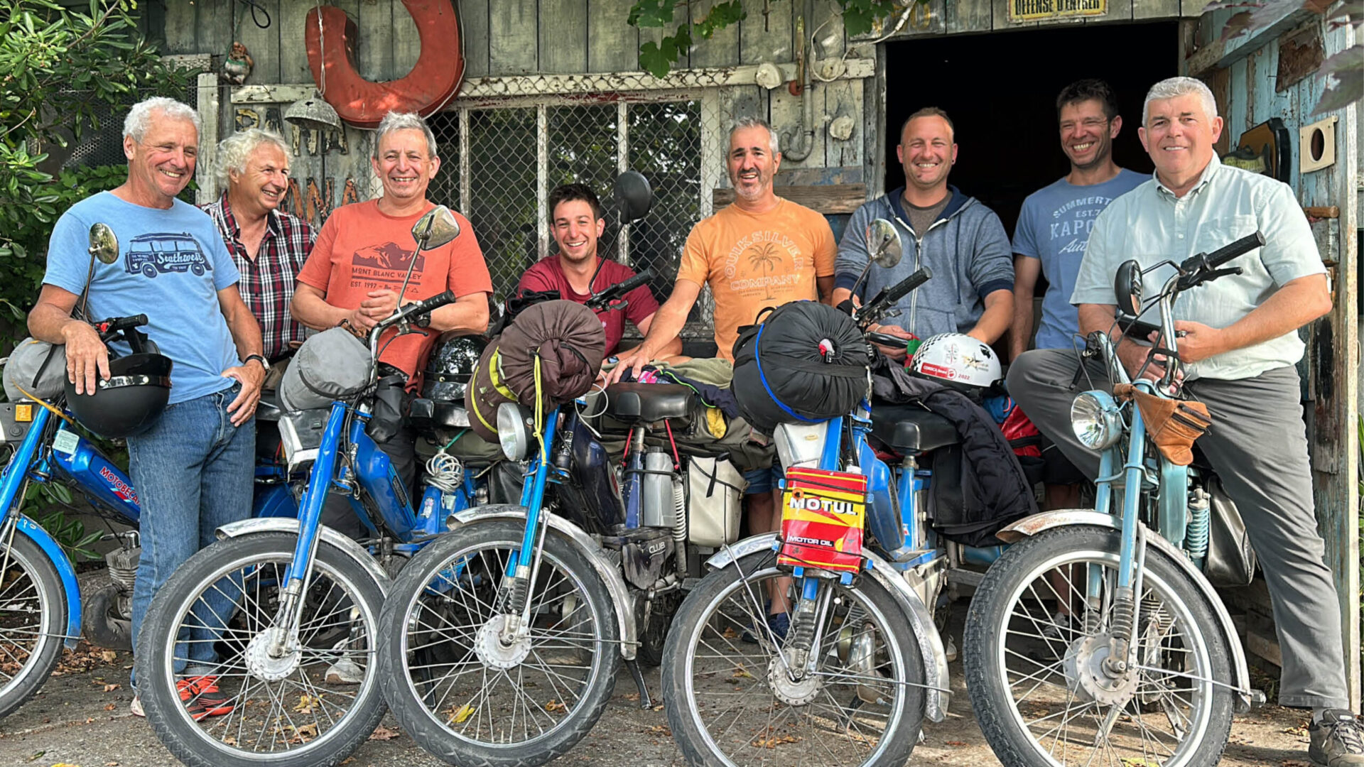 Depuis 12 ans et chaque année, 7 copains du Pays Basque parcourent un coin de France sur les mythiques mobylettes MBK 51. Partis de Mauléon dans le Pays Basque et en route vers Saint Émilion ils se sont arrêtés à Arcachon accueillis par un des deux frères Minos, Alain.