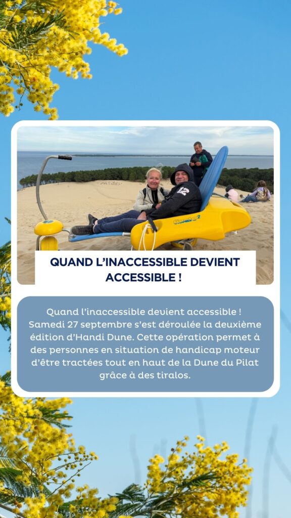 Samedi 27 septembre s’est déroulée la deuxième édition d' »Handi Dune ». Cette opération permet à des personnes en situation de handicap moteur d’être tractées tout en haut de la Dune du Pilat grâce à des tiralos.