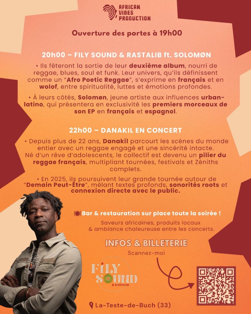 La soirée débutera à 20h avec Fily Sound & Rastalib, qui présenteront leur deuxième album mêlant reggae, blues, soul et funk. Leur style, qualifié d’« Afro Poetic Reggae », s’exprime en français et en wolof, et aborde des thèmes liés à la spiritualité, aux luttes et aux émotions profondes. Ils seront accompagnés par Solomøn, jeune artiste aux influences urban-latino, qui dévoilera en exclusivité les premiers extraits de son EP en français et en espagnol.