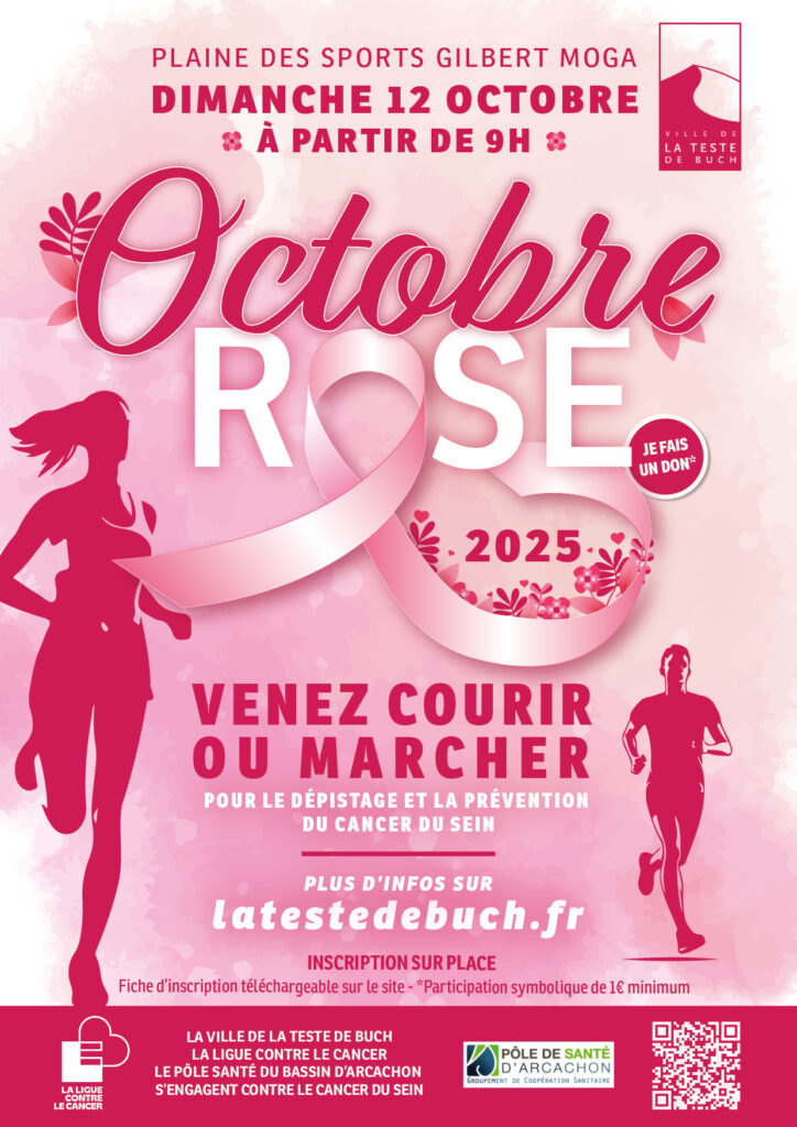 A l’occasion d’octobre rose, la Ville de La Teste de Buch, avec la ligue contre le cancer et le Pôle Santé du Bassin d’Arcachon organisent une marche et une course :