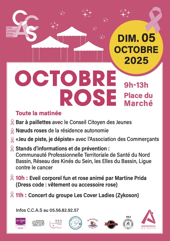 - Dimanche 12/10 sous la Halle 10h : Balade Rose / 11h : mini séance de gym suivie d’une Flash Mob (GV de Mios et de Lacanau de Mios)