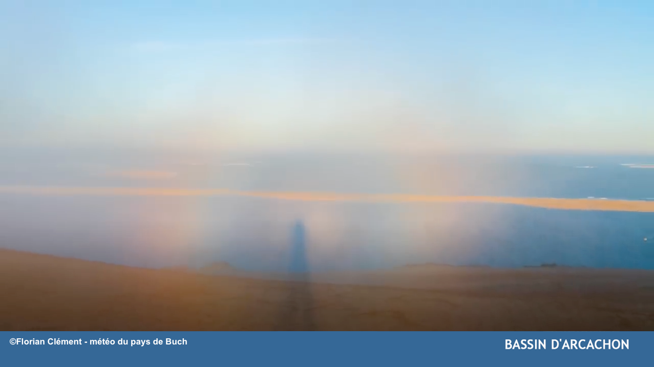 Alors que les minimales oscillaient entre 2 et 5°C ce matin sur le Pays de Buch, les brouillards étaient comme la veille nombreux mais un peu moins épais. Encore plaquées au sol au lever du jour, la petite centaine de mètre d’altitude de la dune permettait de passer au dessus de ces brumes automnales poussées vers la côte par un léger vent d’est. Avec ces conditions, le spectre de Brocken a de nouveau fait une éphémère apparition. J’avais déjà pu observer ce phénomène optique en 2018 et une autre personne l’avais déjà photographié avant. C’était donc ce matin la troisième observation recensée du phénomène sur la dune. Pour pouvoir l’observer il faut s’intercaler dans une pente de manière à avoir le brouillard en contrebas en face de soi et le soleil dans le dos. Cela permet ainsi de voir notre ombre déformée entourée d’un cercle lumineux produit par la rétrodiffusion de la lumière par les gouttelettes d’eau en suspension du brouillard. Les cercles colorés plus larges sont quant à eux liés à de la diffraction et réflexion de la même manière qu’un arc-en-ciel.