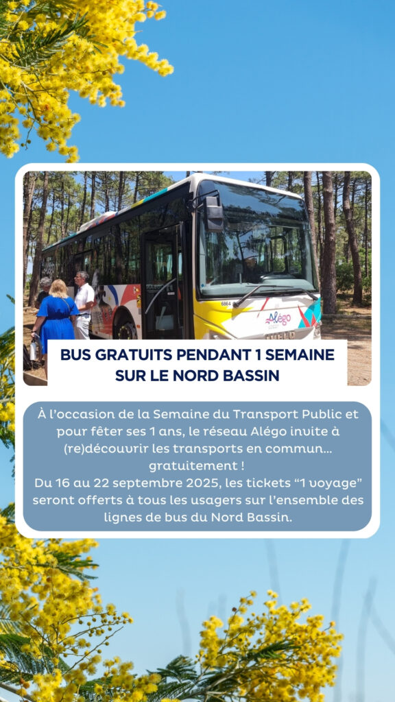 À l’occasion de la Semaine du Transport Public et pour fêter ses 1 ans, le réseau Alégo invite à (re)découvrir les transports en commun… gratuitement ! Du 16 au 22 septembre 2025, les tickets 1 voyage sont offerts à tous les usagers sur l’ensemble des lignes de bus du Nord Bassin.