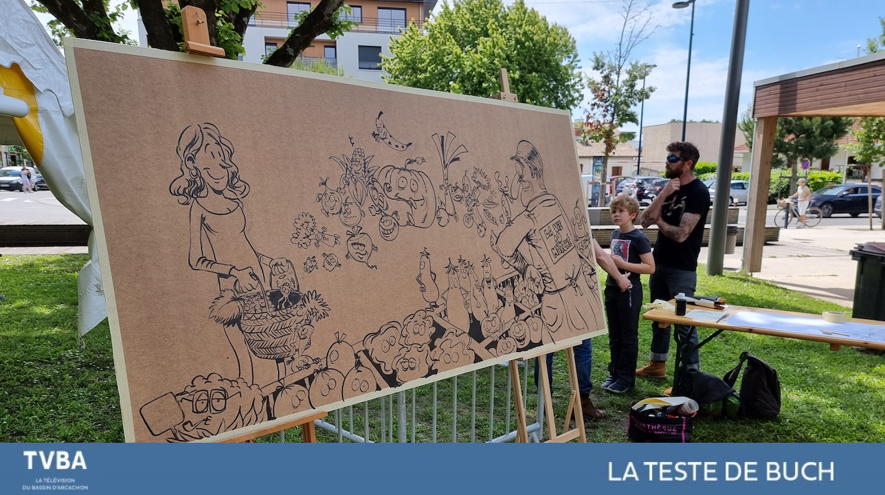 En ce week-end du 29 et 30 Mai trois dessinateurs du collectif Croc en jambe ont dessiné une fresque pour les commerçants du marché de la Teste. Il faudra au total 6h afin de réaliser dessin sur un panneau de 2,5x,2 mètres.