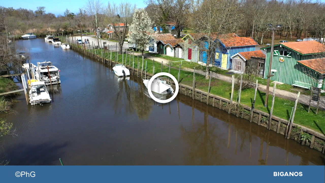C’est un port caché des regards, mais aussi l’un des plus pittoresque du Bassin pour ceux qui poussent la balade jusqu’à la leyre: le port de Biganos. Si l’on conait bien ses cabanes colorées, son port et son environnement arboré, nous vous proposons aujourd’hui un nouveau regard sur cet écrin depuis les airs !