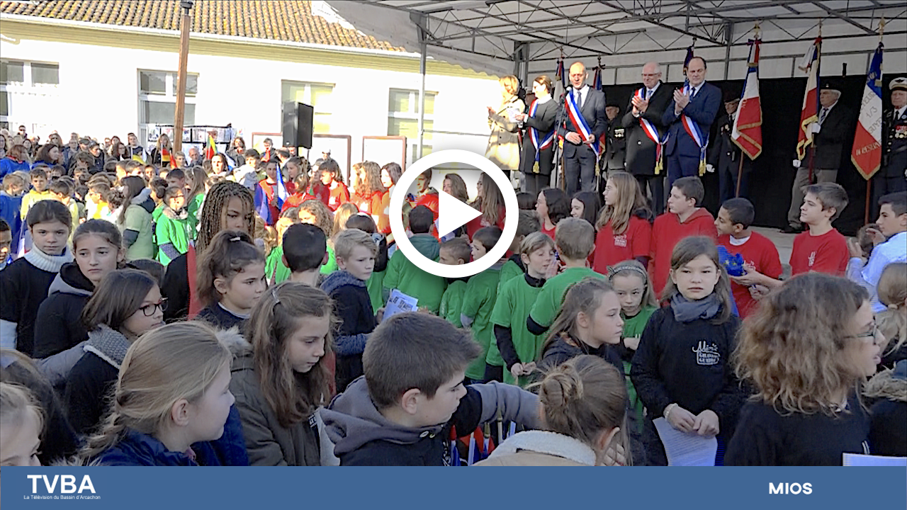 Dimanche matin, à Mios, il n’y avait jamais eu autant de monde réuni place du 11 Novembre. Pour ce centenaire de la fin de la Grande Guerre, la Municipalité avait mobilisé tous les habitants et notamment les plus jeunes. 240 petits Miossais, scolarisés dans les 4 écoles de la ville et au sein du collège, ont ainsi participé à la cérémonie aux côtés des anciens combattants et des autorités. Quatre maires étaient aussi pour l’occasion réunis…